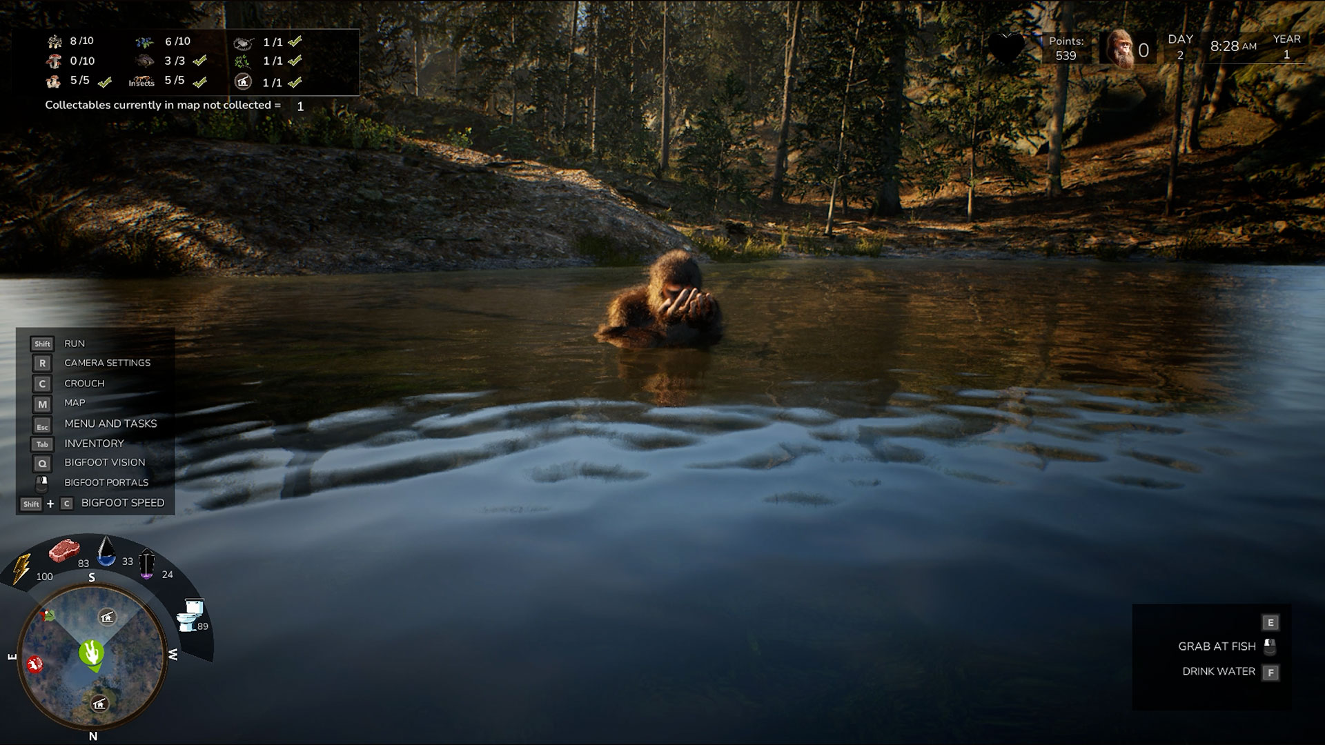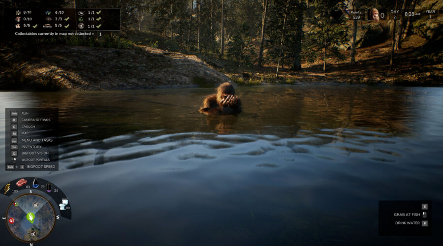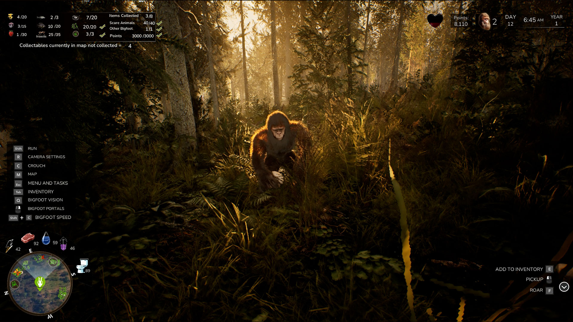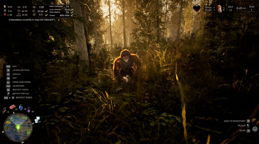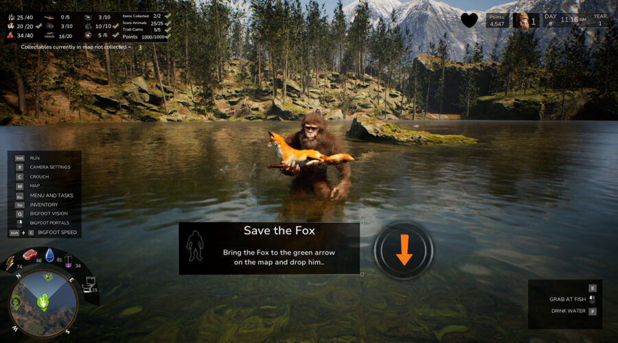 Explore the beautiful forest and live your life as Bigfoot. You are the unseen guardian of the forest. Catch and eat fish, insects, and other creatures. Forage the forest for mushrooms, berries, and more. Build shelters to store your items in to get through the harsh winters. Acquire new Bigfoot Skills like Bigfoot Vision, Speed, Portals, and Strength. Watch out for human Bigfoot hunters. They will be trying to find you and photograph you. Steal their items to earn points and complete tasks.